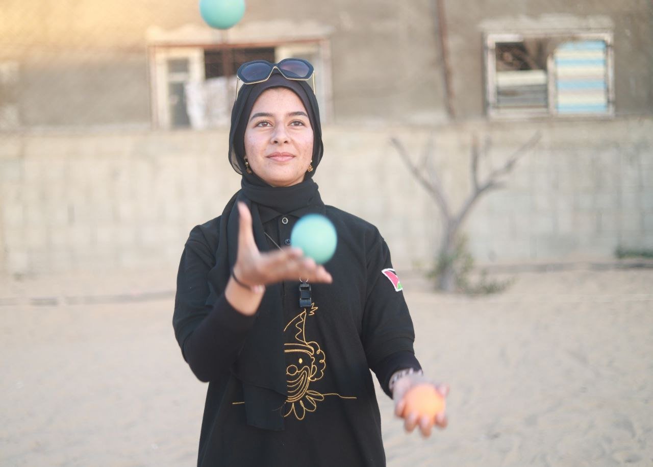 ترتفع ضحكات أطفال يتعلمون رمي الكرات في الهواء، قبل أن يمزقها دويّ انفجار قريب. تتساقط الكرات المليئة بالرمال وتتعثر الحلقات تحت الأقدام الصغيرة، فيندفع الصغار مذعورين بين الخيام في مواصي خانيونس جنوب قطاع غزة. وسط هذا المشهد المتناقض، تقف شهد حمدونة (20 عامًا) تحاول إعادة الفوضى إلى لعب، مستندة إلى ما بقي لديها من فنون السيرك لتصنع للأطفال فسحة أمل في قلب الحرب.