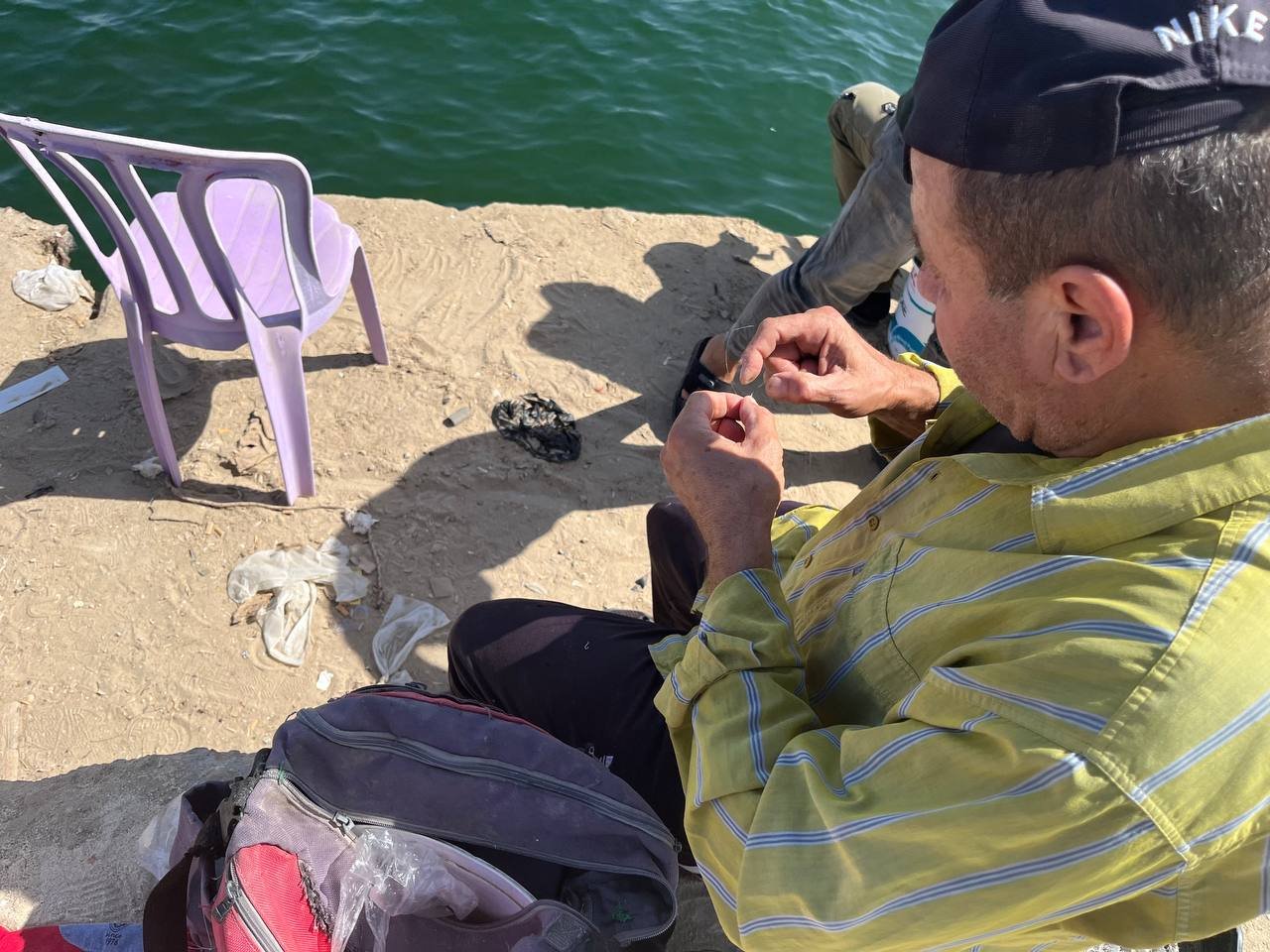 يحمل الرجل في رحلته شبه اليومية، سلة بلاستيكية مثقبة يخرج من أحد طرفيها رأس الصنارة، وفي الداخل يلف قارورة مياه باردة بقطعة قماش من القطن يقول إنها تساعد على الاحتفاظ بالبرودة في هذا الطقس الحار.